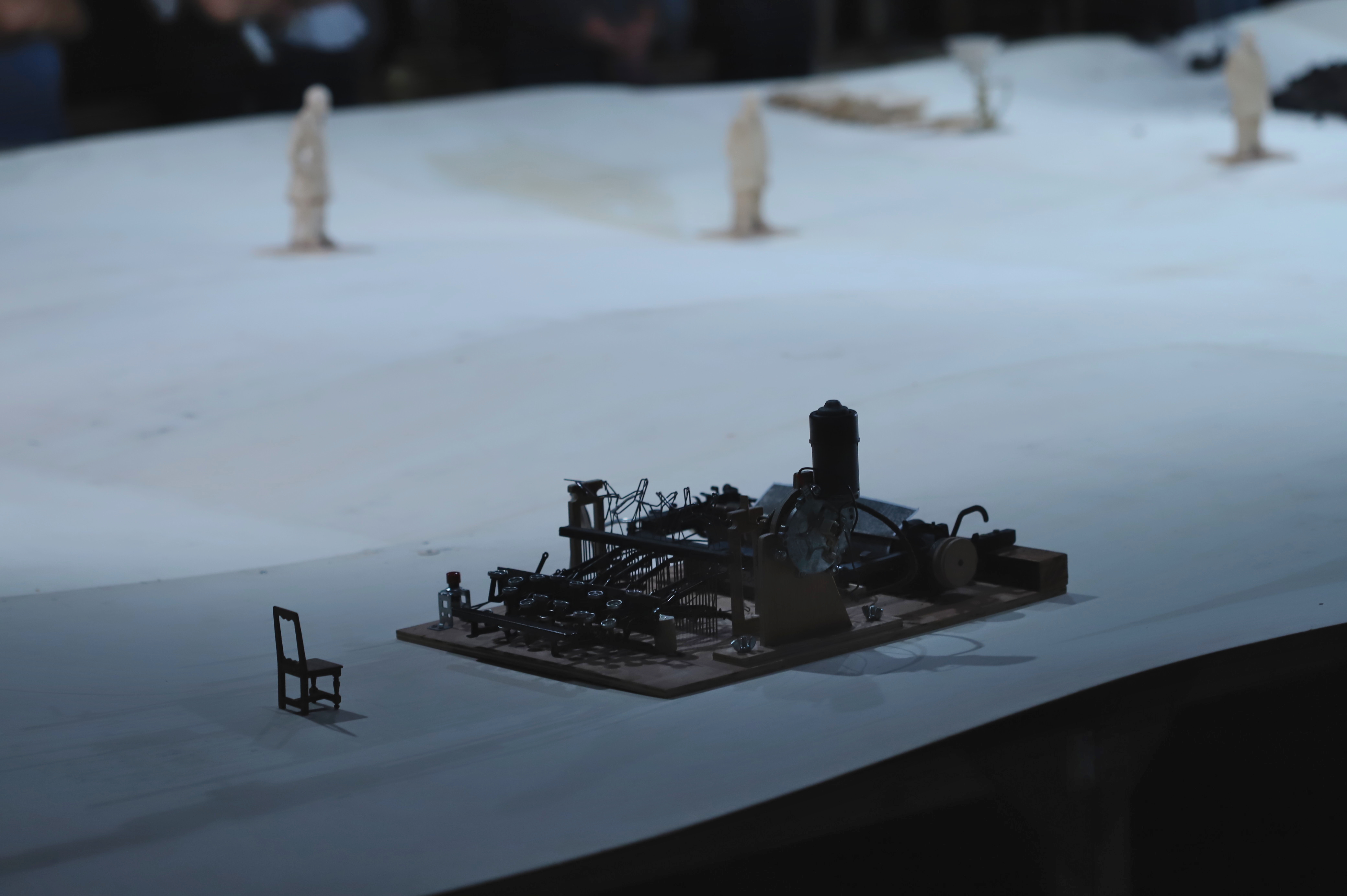 Tant sur le plateau qu’au foyer-bar du Théâtre 71, vous serez invité·e à circuler avec les manipulateur·ices autour de ces surprenantes installations, jouant des perspectives et des disproportions, de l’aspect brut des matériaux autant que de la délicatesse de certaines évocations. Sur l’immense plaine de l’Opus II, de petits êtres s’affairent autour d’étranges tâches, sous l’œil d’une société de surveillance. L’Opus III convoque la mémoire des temps industriels et rend hommage à tout un passé d’un peuple de travailleur·euses. Ézéquiel Garcia-Romeu déploie, avec une époustouflante force émotionnelle, de saisissants paysages allégoriques qui nous parlent du monde d’aujourd’hui, entre nos renoncements et nos utopies.